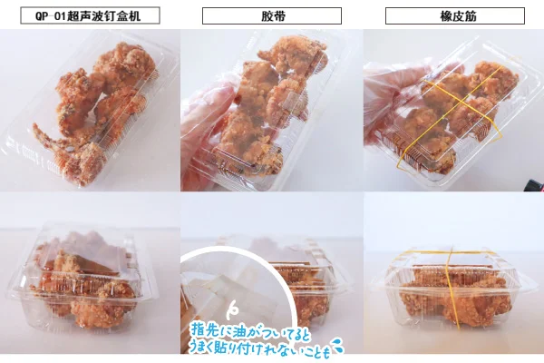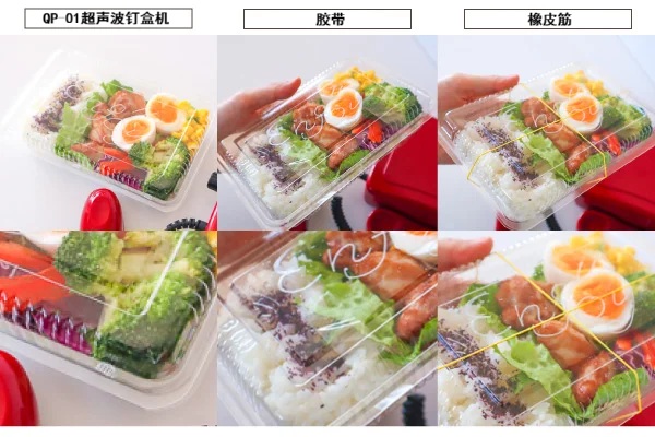 QP-01超声波钉盒机广泛应用于食品包装盒密封。 随着近年包装材料价格上涨,众多餐饮经营者正积极寻求包装方案优化。 传统卡扣式食品盒虽便捷但成本较高, 而非卡扣式食品盒(需依赖胶带/橡皮筋固定)以其极致性价比成为成本控制的首选方案。